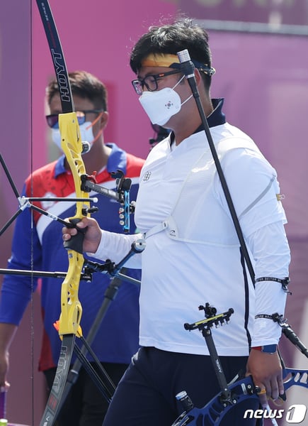 올림픽 남자 양궁 순항 (도쿄=연합뉴스) 손형주 기자 = 26일 일본 도쿄 유메노시마 공원 양궁장에서 열린 양궁 남자단체전 준결승전 일본과의 경기에서 한국의 김우진(오른쪽), 김제덕(왼쪽) 김우진. 남자 양궁 단체 금메달 ㅅㅅㅅㅅㅅㅅㅅ.